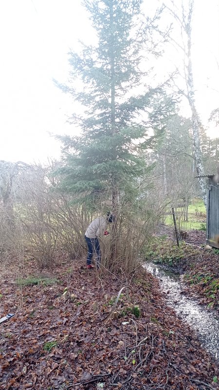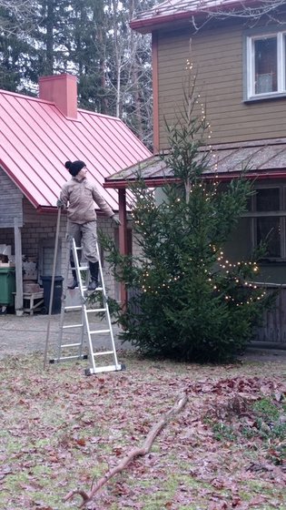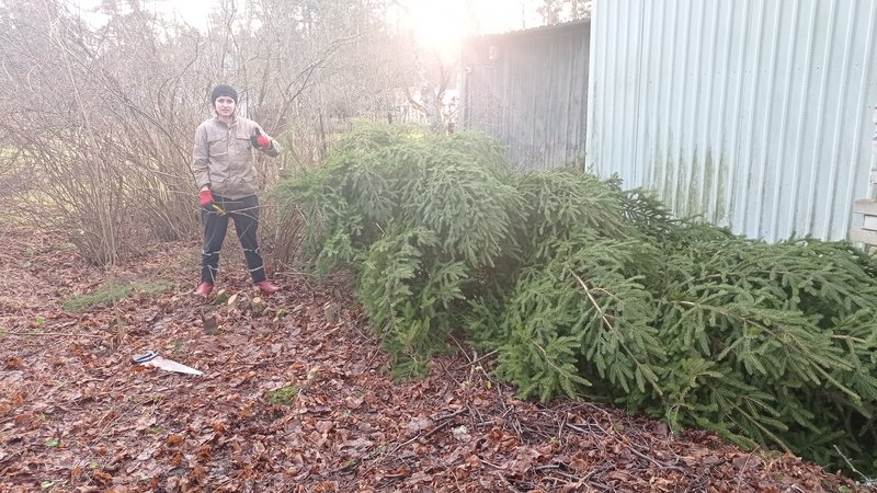 Meie jõulupuu on ka sel aastal „lihtsalt umbrohi“, mis kasvas kraavis ja tuli eemaldada. Pärast selle maha lõikamist saime aru, et isegi latv ei mahu tuppa. Nii me siis panimegi selle välisukse ette üles.